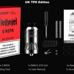 Hellvape Helheim S 25mm RDTA, com capacidade de tanque de 5mL, deck de construção sem postes e dois sistemas de controle de fluxo de ar para oferecer sabor e vapor deliciosos. Construído em aço inoxidável durável, o Helheim S RDTA utiliza um deck de construção de bobina única, aceitando configurações de bobina grandes ou exóticas dentro dos terminais baseados em deck. Fixado lateralmente por parafusos de cabeça chata, o Helheim S 25mm RDTA utiliza 4 fios de aço inoxidável para puxar o eJuice até o convés e a estrutura da bobina instalada.