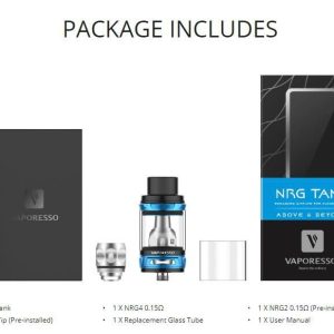 O mais novo tanque sub-ohm do Vaporesso, o NRG Sub-Ohm Tank, é um sistema de preenchimento de topo de 26,5 mm, deslizante para encher, capaz de suportar até 5 ml do seu E-Liquid favorito. O tanque NRG Sub-Ohm utiliza a família GT Coil e inclui uma cabeça GT 4 de 0,15 ohm e uma cabeça de bobina GT 8 de 0,15 ohm. A cabeça da bobina GT 4 é uma bobina dupla vertical, com profundidades de 30 a 70W, enquanto a cabeça da bobina GT 8 é uma bobina vertical quádrupla, classificada para 50 a 110W. O fluxo de ar entra no tanque NRG Sub-Ohm através do fluxo de ar inferior ajustável duplo que é totalmente fechavel e tem uma camada extra de isolamento de aquecimento. Uma ponta de gotejamento exclusiva de malha delrin de 14 mm que evita a cuspir de volta e um adaptador de ponta de gotejamento 510 está incluído no tanque. Com sua grande capacidade de tanque e facilidade de uso, o Vaporesso NRG Sub-Ohm Tank está “acima e além” dos outros tanques sub-ohm no mercado.