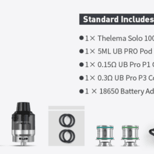 O Thelema Solo é um kit com faixa de saída de 5-100w, conjunto com controle de temperatura e utiliza uma única bateria de alta amperagem. Construído a partir de liga de zinco durável, o Thelema Solo é impermeável e resistente. Aceitando uma única bateria de 21700 de alta amperagem, o Thelema acompanha em seu kit um um adaptador para ser usado com bateria 18650 no lugar de uma 21700. Além disso, aqueles que não gostam de construir descobrirão que seu tanque sub-ohm funciona de forma perfeita e eficiente.