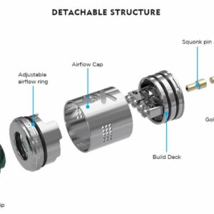 Este é um RDA de 24 mm (diâmetro) por 25,5 mm de comprimento / altura. É completamente destacável com estas peças: Ponta de Gotejamento de Resina, Anel de Fluxo de Ar Ajustável, Tampa de Fluxo de Ar, Construir Deck, Banhado a Ouro com 510 Pinos e Pino de Squonk.