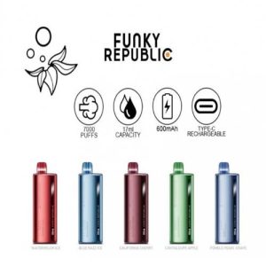 O Pod DescartĂĄvel Funky Republic Ti7000 com 7000 puffs é ativado por sucção e prĂ©-preenchido com 17 ml de lĂquido de e-juice de sal de nicotina de 50 mg. O Funky Republic Ti7000 é excepcionalmente suave, saboroso e fornece prazeres na garganta extremamente satisfatĂłrios.Â