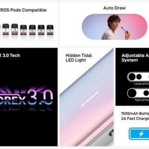 • Compatibilidade: usa os pods da série XROS (0,4 Ω, 0,6 Ω, 0,8 Ω, 1,0 Ω, 1,2 Ω), recarregáveis via sistema top-fill de 2 ml (ou 3 ml em versões fora da UE)