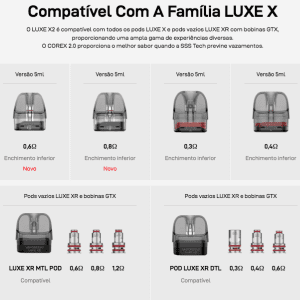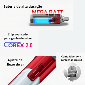 Com fluxo de ar ajustável e compatibilidade com diversos pods da linha LUXE X, o LUXE X2 permite que você adapte sua experiência de vaporização MTL conforme suas preferências. Além disso, o dispositivo conta com dupla ativação, podendo ser utilizado tanto por tração quanto pelo botão, garantindo máxima praticidade e flexibilidade.