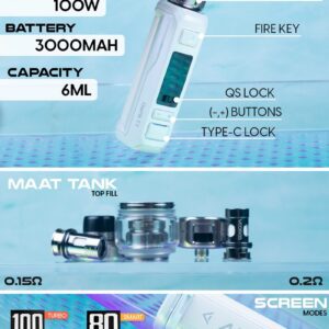 O Argus MT Kit está efetivamente equipado com uma bateria de 3000 mAh (recarregável via USB), tem uma potência máxima de saída de 100 watts. O kit vem com o depurador MAAT Tank e 2 bobinas TPP em 0,2 Ω e 0,4 Ω . O MAAT é totalmente compatível com todas as bobinas TPP da Voopoo.