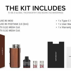 Produzindo entre 5 e 80 W, o Kit Vaporesso LUXE 80 pode acomodar bobinas da série GTX Coil e vem com uma bobina de malha de 0,2 ohm e 0,3 ohm para fornecer sabor e vapor delicioso.