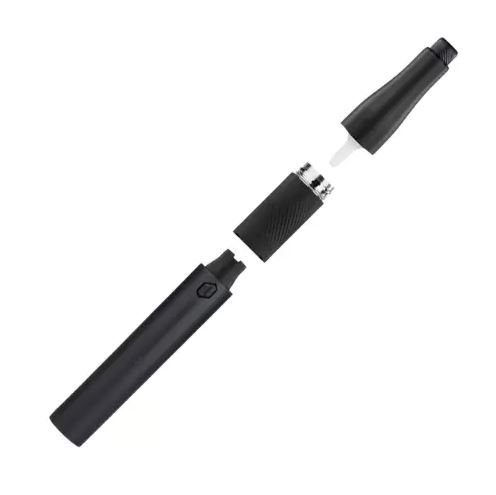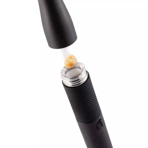 A boca do aparelho conta com uma ferramenta embutida retrátil, a chamada “dart” — feita de cerâmica com extremidade de silicone. Esse detalhe evita sujeira durante o carregamento dos concentrados, eliminando a necessidade de dab tools externas e tornando o processo prático e limpo.