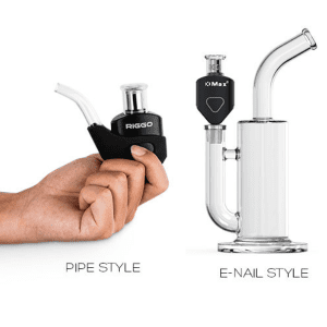 O RIGGO apresenta um design modular que facilita a transição entre os modos e-nail e cachimbo. No modo cachimbo, suas dimensões são de 103,2 mm de altura, 98,2 mm de largura e 32,0 mm de profundidade. No modo e-nail, as dimensões são de 112 mm de altura, 49 mm de largura e 28 mm de profundidade. O dispositivo é construído com materiais de alta qualidade, incluindo um corpo de alumínio e um bocal de vidro, garantindo durabilidade e uma experiência de uso premium.